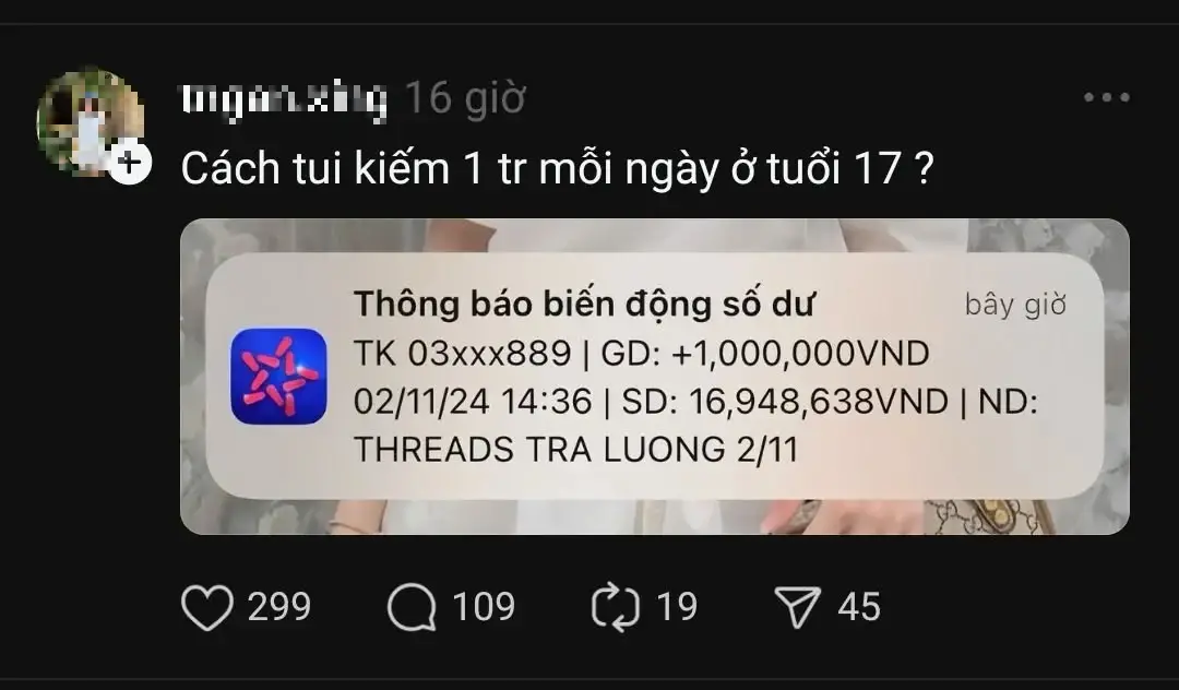 Trong những ngày gần đây, nhiều người dùng mạng xã hội, đặc biệt là các bạn trẻ thuộc thế hệ Z, đã chia sẻ các hình ảnh chụp màn hình về những sao kê ngân hàng, các tin nhắn xác nhận chuyển khoản của nền tảng Threads. Thật kỳ lạ, số tiền mà họ nhận được chỉ là vài trăm nghìn hoặc vài chục nghìn đồng, chưa đáng kể so với những gì họ mong đợi. Tuy nhiên, chính sự mập mờ này đã khiến cộng đồng tin rằng họ đang có một cơ hội kiếm tiền chân chính, dễ dàng, hấp dẫn. Đó chính là một chiêu trò vô cùng tinh vi, được dàn dựng cẩn thận nhằm tạo dựng niềm tin giả để lôi kéo nhiều người tiếp tục tham gia.
